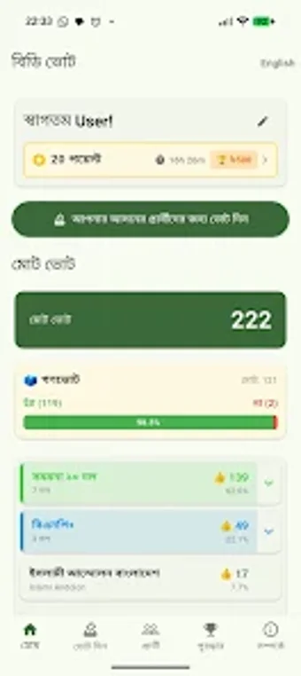 bdvote es una aplicación diseñada para seguir el sentimiento electoral de las elecciones generales de Bangladesh enPermite a los usuarios votar por candidatos, participar en referendos y ganar puntos que pueden canjearse por premios diarios en efectivo. La app incluye un sistema de competencia diaria donde el mejor participante puede ganar ৳500 cada día, además de un atractivo sistema de acumulación de puntos por diversas actividades como votar, completar encuestas o referir amigos.